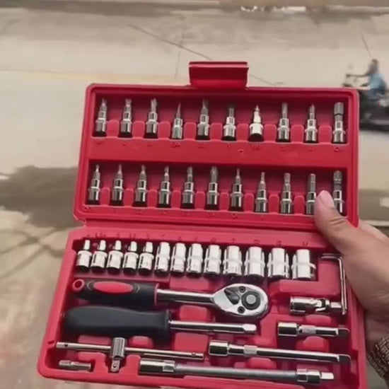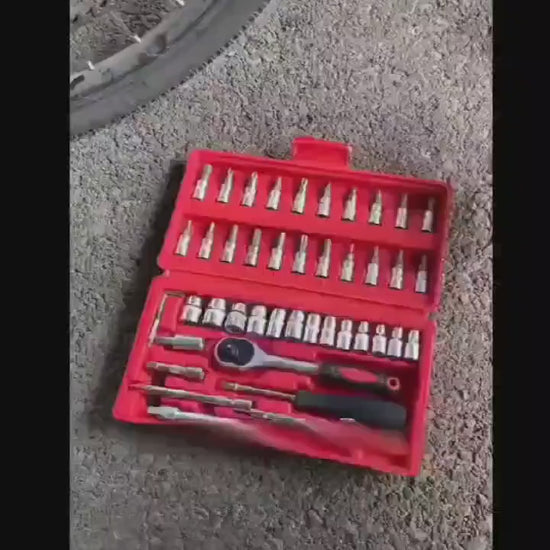 This premium 46-in-1 Tool Kit is the ultimate all-purpose solution for every home, bike, and car repair need, designed with durable metal tools organized in a compact 15×10×5 cm case for easy storage and portability. Whether you're fixing appliances, tightening screws, working on vehicles, or handling precision tasks, this multi-purpose ratchet wrench and socket set delivers unmatched convenience and performance. With ergonomic grips, assorted high-quality bits, and a sturdy ratchet handle, it ensures quick, effortless repairs for beginners and professionals alike. Perfect for home improvement, emergency fixes, and on-the-go maintenance, this tool kit brings reliability, versatility, and value all in one pack.